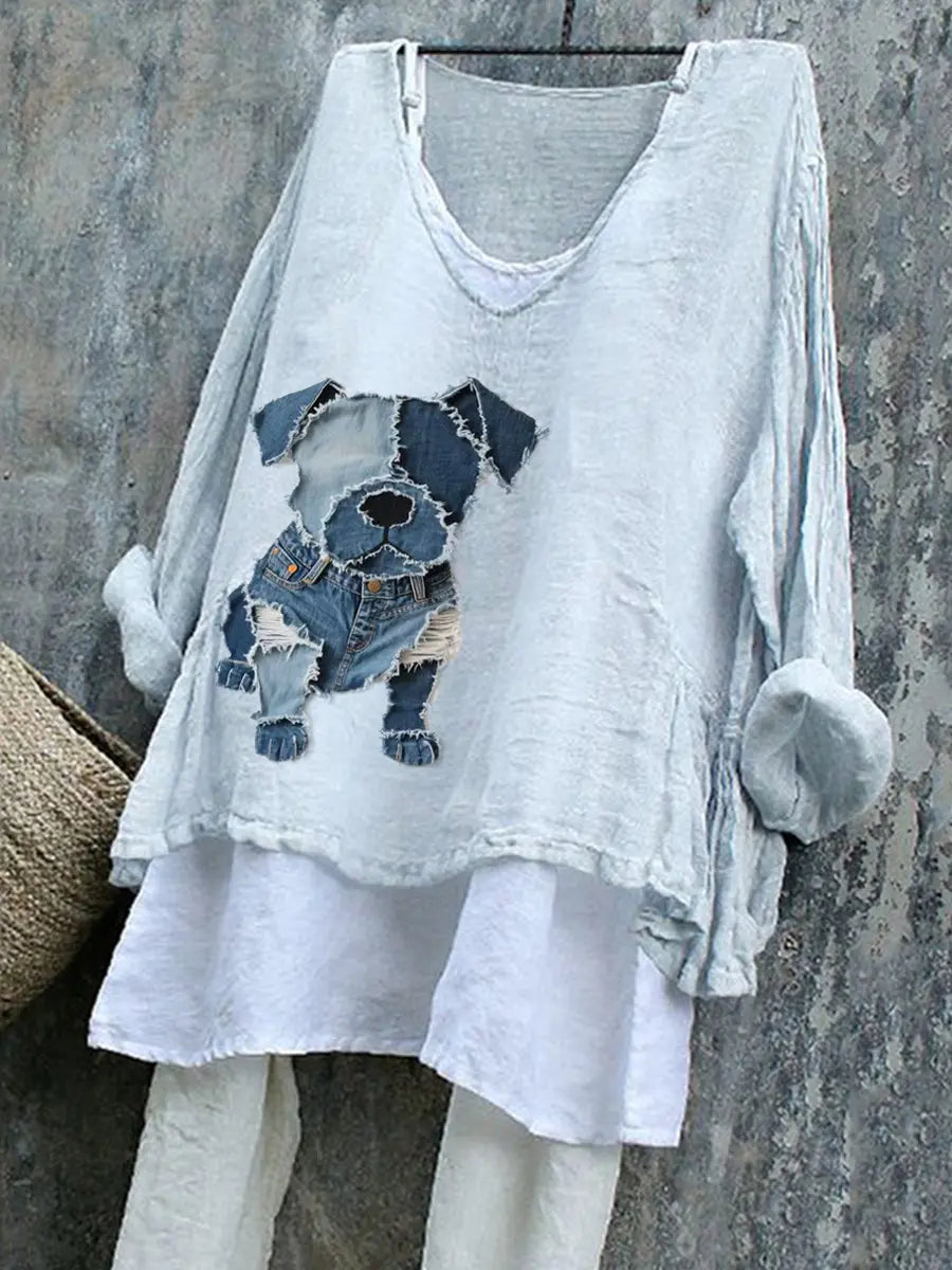 Women's Cute Dog Pattern Patchwork Art Linen Shirt