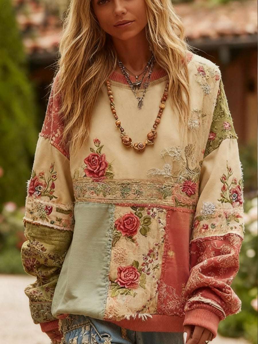 Women's Breast Cancer Awareness Floral Patchwork Crew Neck Sweatshirt
