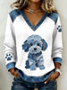 Women's Lovely Dog Pattern Denim Patchwork V-Neck Top