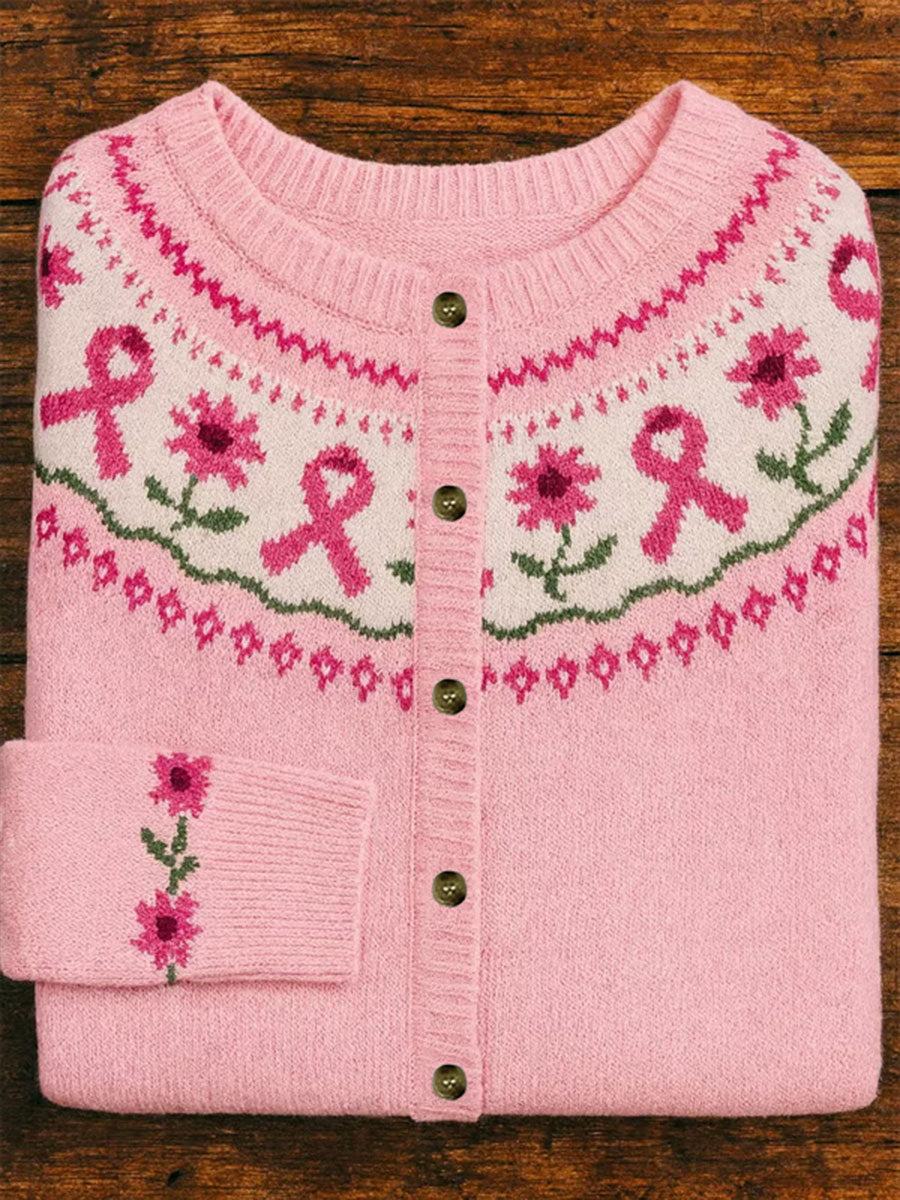 Women's Pink Ribbon Floral Print Casual Cardigan