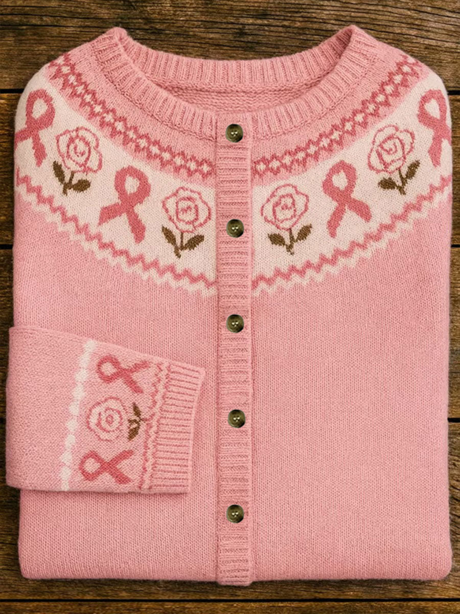 Women's Pink Ribbon Floral Print Casual Cardigan